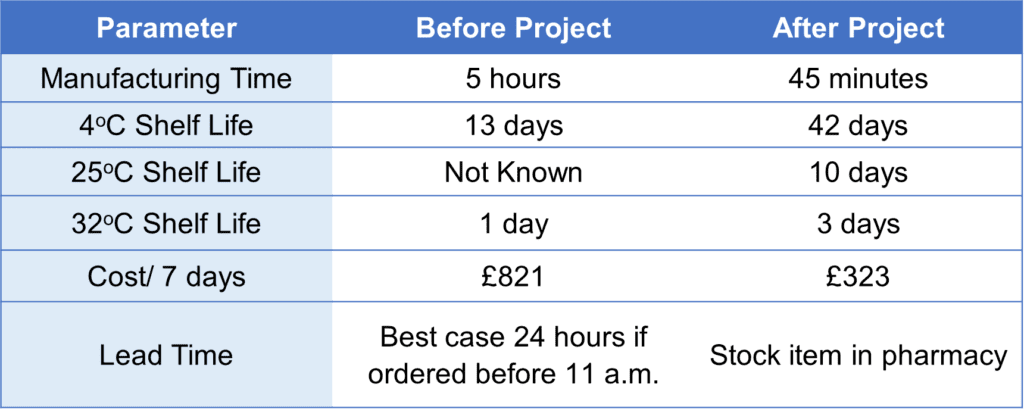 This project has developed a production method to produce 8g/ 240 mL flucloxacillin elastomeric devices that can be integrated into the Aseptic Production facilities in Wrexham Maelor Hospital (YMW). By investing 3 hours / week of manufacturing time and implementing the OPAT manufactured by Technical Services the following savings can be realised across a 12-month period (assuming one patient per week is treated):
