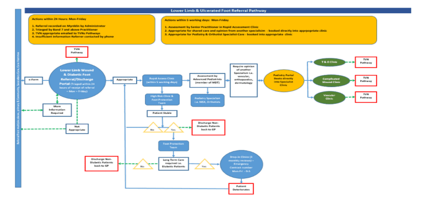 - Required assurance of meeting NICE guidelines for lower limb wounds, in particular triage of diabetic foot ulcer referrals within 24hrs.