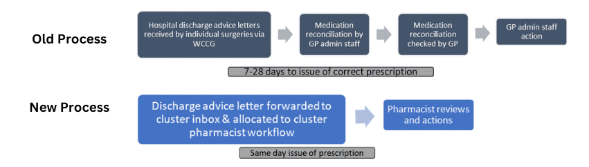 Since March 2020, Cluster Pharmacists at Cardiff Southwest Cluster have supported patients with medication reconciliation after hospital discharge at a cluster-based care hub. This initiative addresses shortcomings in the previous medication reconciliation process, which was prone to delays and errors due to lack of clinical training among surgery staff and time constraints on GPs. This has allowed a rapid, safe and effective update of medications, improving the quality of care and freeing up time for primary care teams to work prudently.