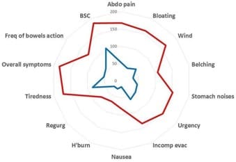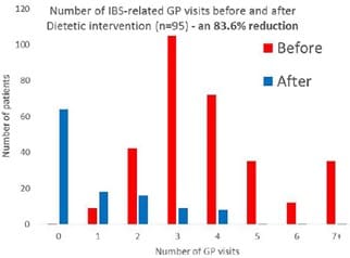 Additional benefits of the low FODMAP diet Intervention with the low FODMAP diet has also shown benefits with a reduction of 83.6% in IBS-related GP visits as shown in the graph: