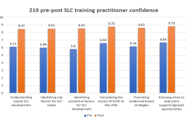 For the 219 staff that completed the training evaluation, confidence across various domains increased from 6.22 to 8.61 on average on a 1-10 scale: